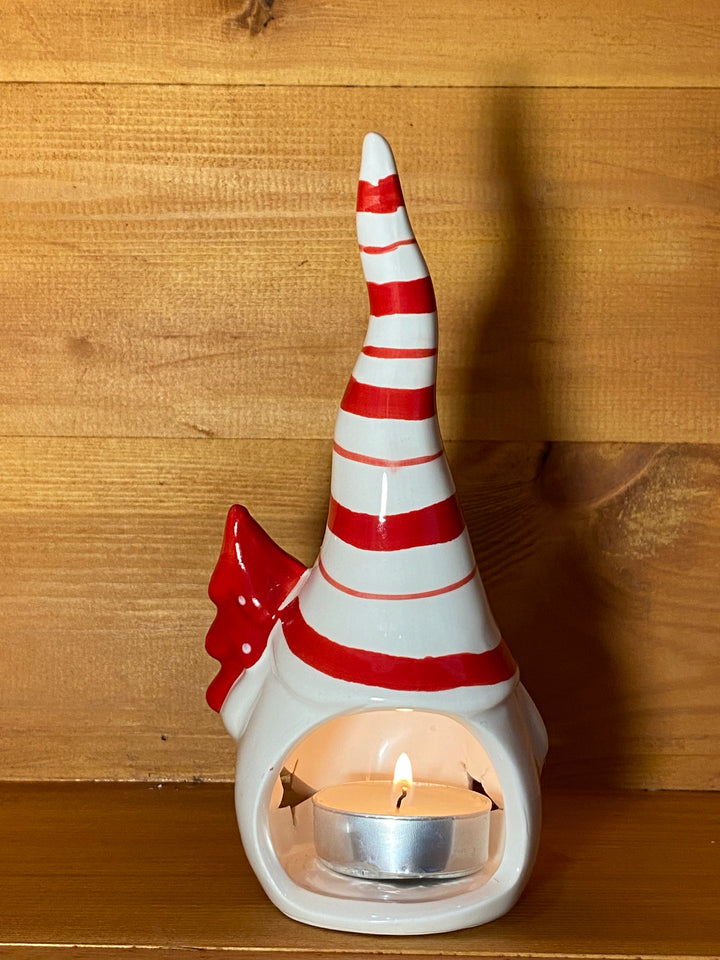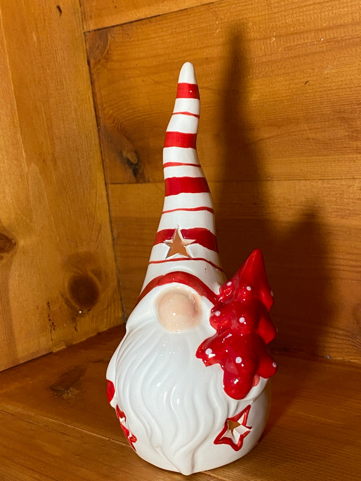 Bring a touch of cosy Scandinavian charm to your festive décor with this adorable ceramic Santa gonk tealight holder. At approximately 16cm tall, this sweet little character features a tall red-and-white striped hat, a cheerful red spotty Christmas tree in his hands, and a soft, rounded gonk silhouette that adds instant warmth to any room.
