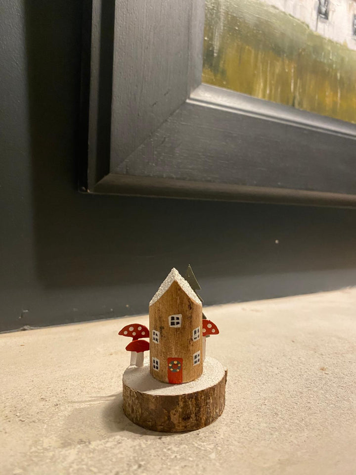 This little cute fairy cottage sits on top of a plinth with a little toadstool forest! Just loveley!