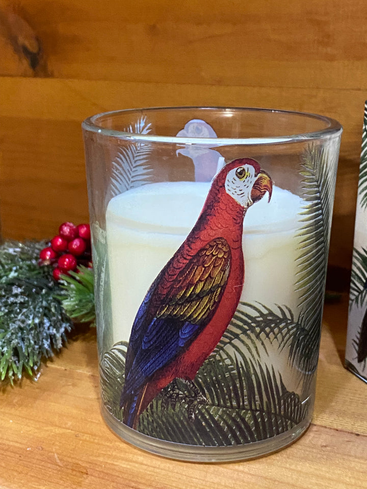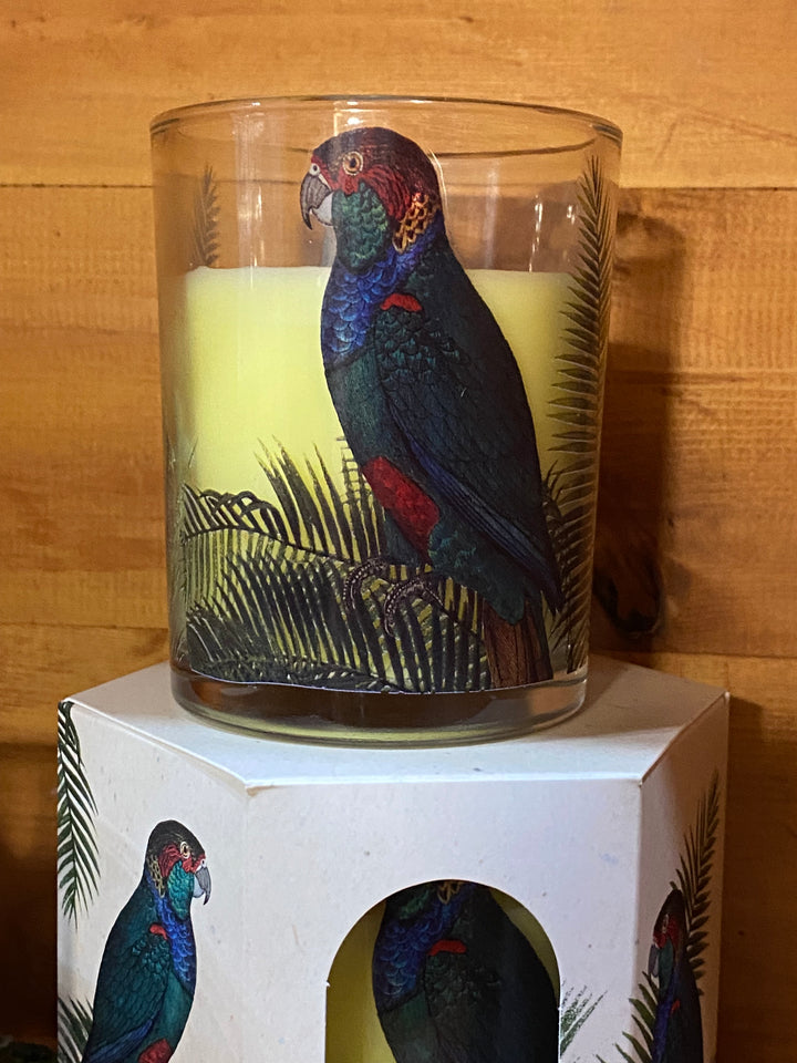 Palm Breeze: Decorated with striking blue-toned parrots, this candle delivers a refreshing, tropical aroma that brightens any room.
