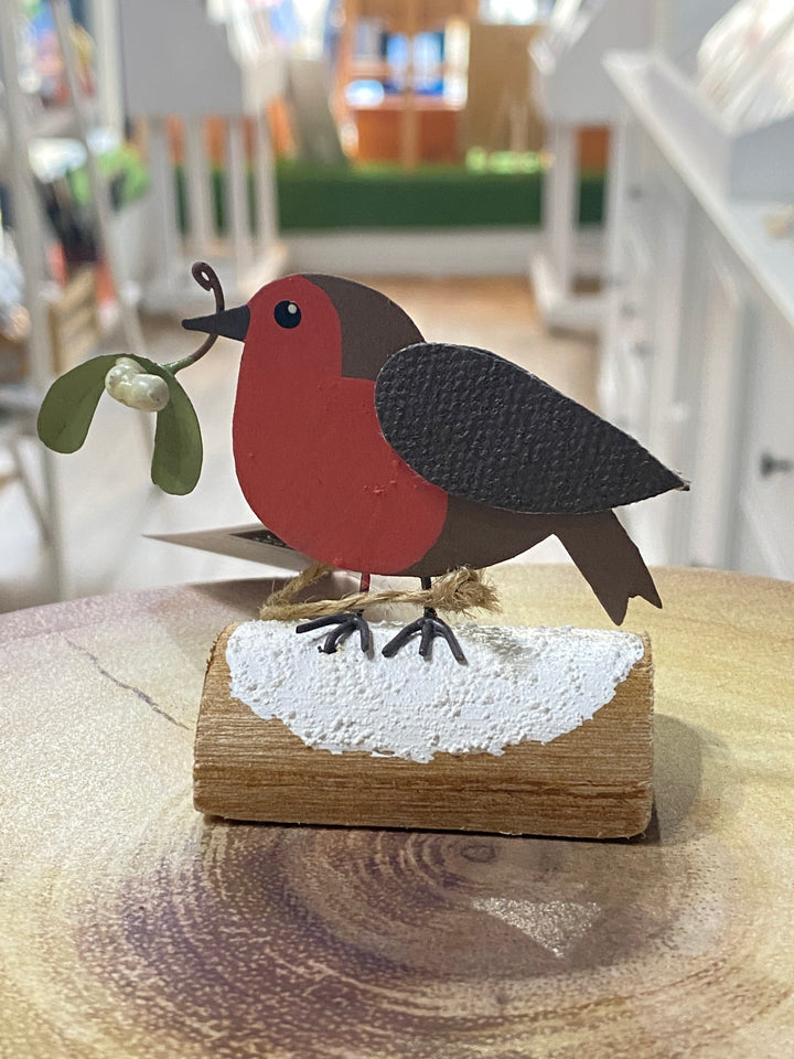 A delightful Christmas Robin holding a sprig of Mistletoe sat atop a wee log.