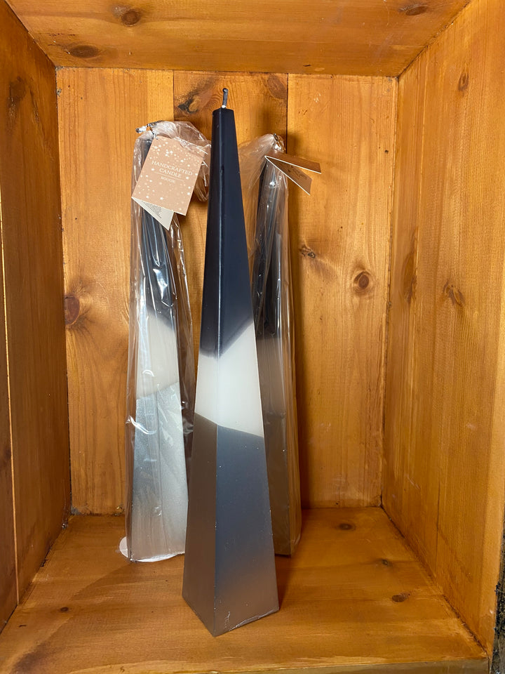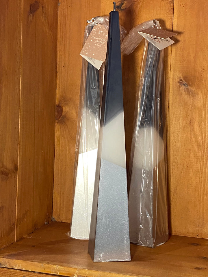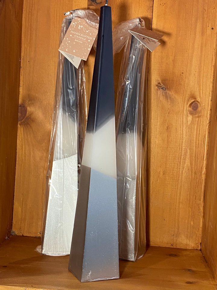 Meet your new favourite festive candle! This tall pyramid design blends silver at the base into soft white, finishing with a bold black tip. At around 33cm tall, it makes a stylish statement on any table or shelf and adds a modern twist to seasonal décor.